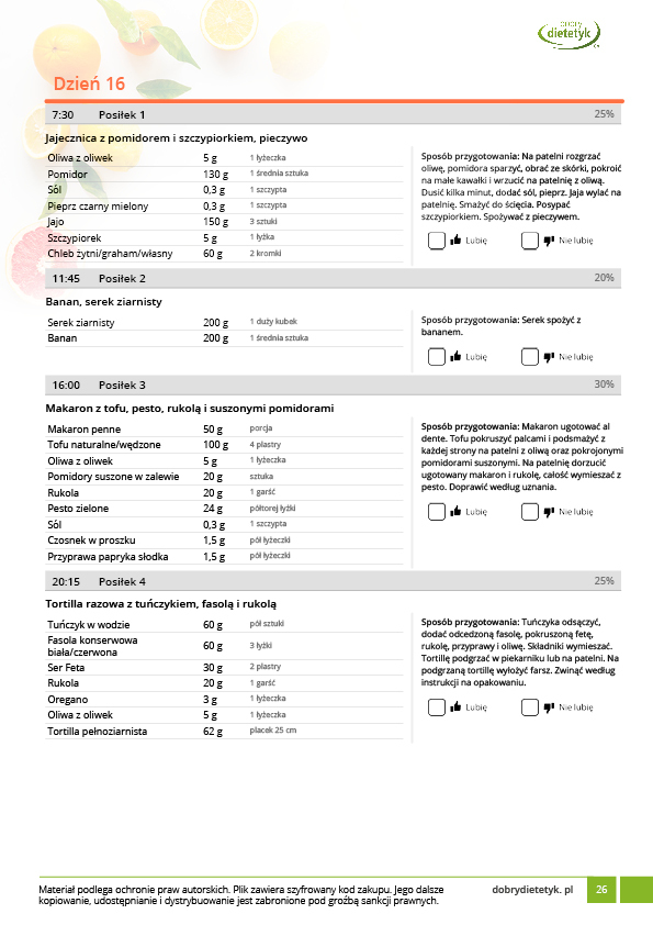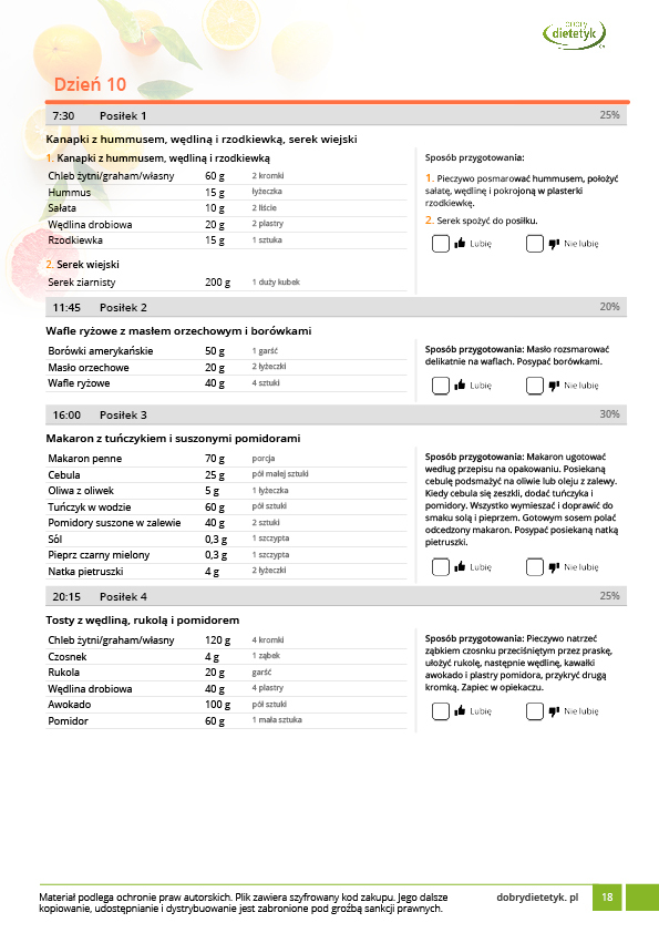 • w formie precyzyjnych jadłospisów wielodniowych (na każdy dzień miesiąca jest opracowany osobny jadłospis). Tutaj nie musisz zastanawiać się co zjeść każdego dnia, gdyż będziesz mieć dokładnie wszystko rozplanowane.