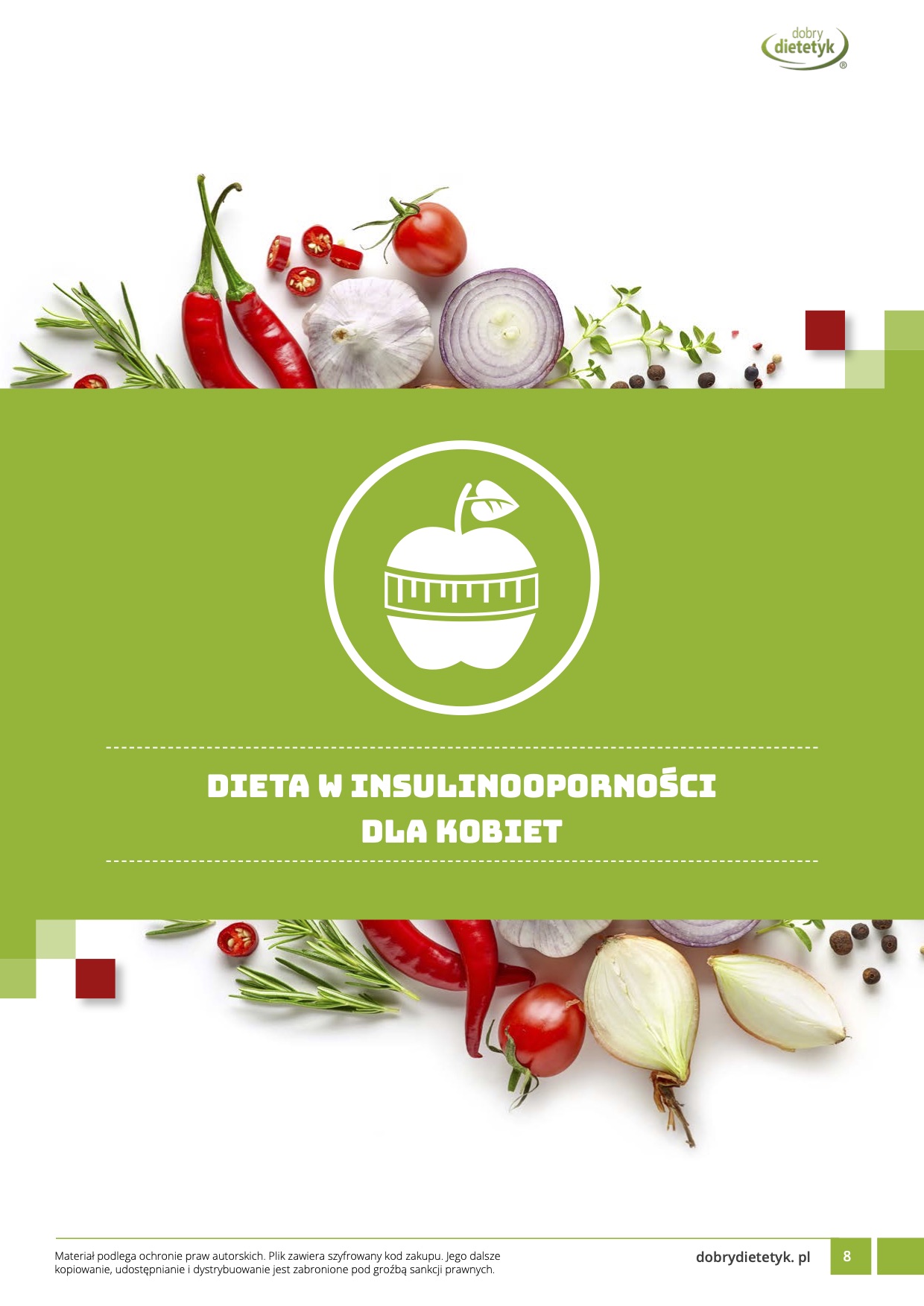 Kompleksowy program żywieniowy dla KOBIET z zaburzeniami gospodarki węglowodanowej, takimi jak: insulinooporność oraz hiperinsulinemia. Jadłospis na 30 dni został opracowany tak, by wspomagać redukcję masy ciała oraz regulację poziomu glukozy i insuliny we krwi. Dieta została skomponowana o zasady niskiego ładunku glikemicznego z ograniczeniem podaży cukrów prostych. Zwrócono także uwagę na zawartość najważniejszych przy zaburzeniach gospodarki węglowodanów składników, takich jak: witaminy z grupy B, magnez, kwasy tłuszczowe omega-3 oraz błonnik pokarmowy. Zachowane zostały odpowiednie dla zachowania zdrowia proporcje kwasów tłuszczowych. Dieta sprawdzi się także idealnie u kobiet, u których stwierdzono hipoglikemię reaktywną lub stan przedcukrzycowy.